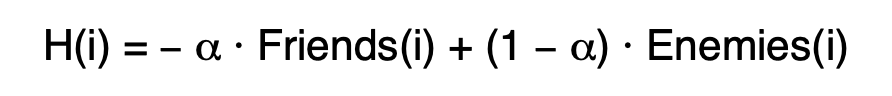 The mechanism can be captured in a neat formula. Let’s define a simple model of cognitive dissonance minimisation where each person strives to reduce local worldview tension within their immediate social environment. Let’s consider this local tension as H(i). Let’s assume that, in a social network, such a person has two categories of ties: Friends and Enemies, understood as people with relatively aligned or relatively opposed views. The model assumes two parallel goals: greater agreement with friends, and greater disagreement with enemies. This is not a description of moral intentions, but a simplified representation of a mechanism that reduces “discomfort”.