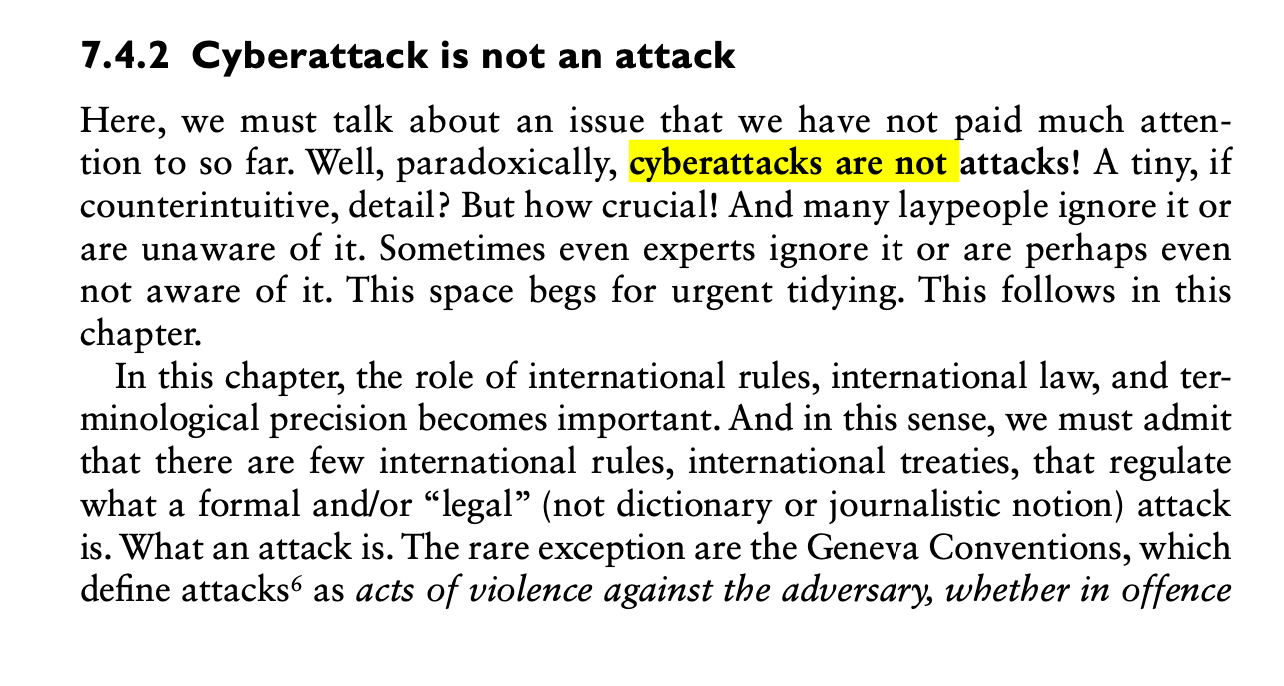 BBC asked some politically-involved “groups” what they think of it. They apparently didn't have much to say, at least initially. However, amusingly, not long afterwards the two groups (Russian, Ukrainian) responsible for basic-cyber-events vowed to comply by the rules. That could obviously be read as a success of the ICRC action. Except for the small detail that adopting a metric of interpreting a vow by the two groups of the kind, that is, actors likely incapable of (or not aiming for doing so, which for the needs of this analysis makes no difference) conducting activities in line with those on the ICRC-point-list (at least points: 1, 2, 3, and impactful 4) would be an improper analysis. Why? This is because the term of ‘attack’ threshold is not the same as the term ‘cyberattack’, which is used widely. And I’ll cite my book here: