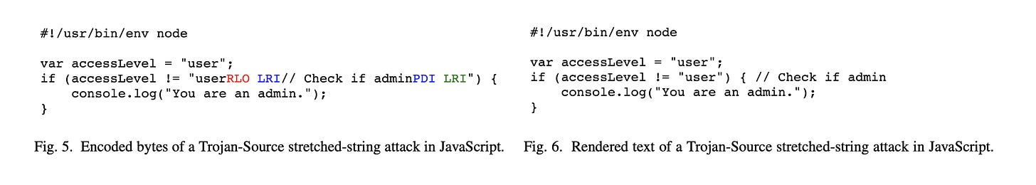Tricking code reviewers. To introduce backdoors. "New type of attack in which source code is maliciously encoded so that it appears different to a compiler and to the human eye. This attack exploits subtleties in text-encoding standards such as Unicode"