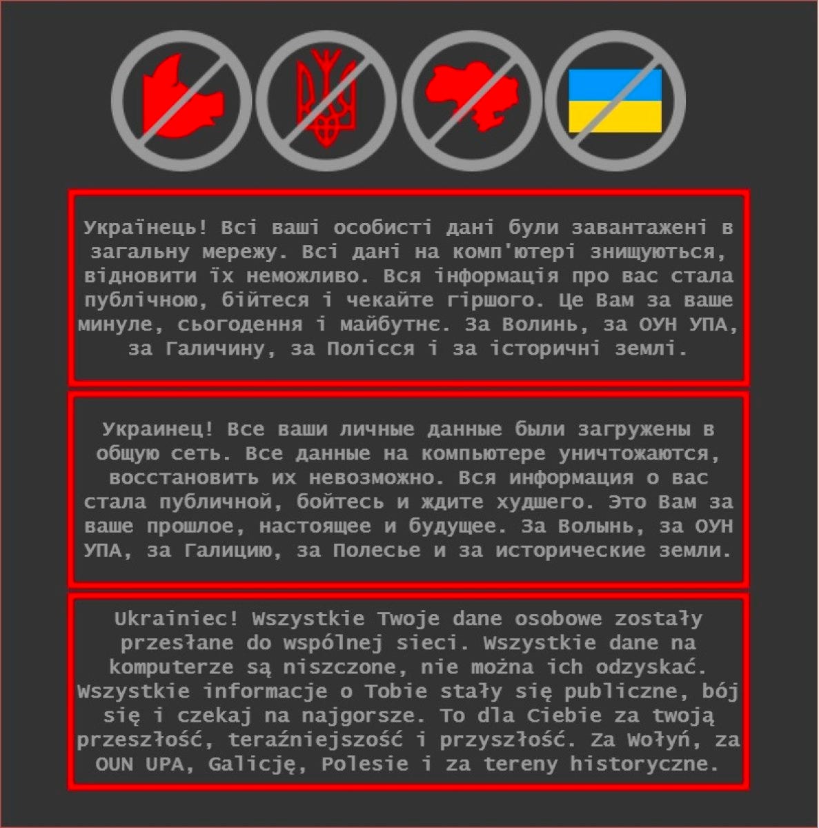 “Ukrainian! All your personal data has been uploaded to a shared network. All data on the computer are being destroyed, it cannot be recovered. All information about you has become public, be afraid and wait for the worst. This is for you for your past, present and future. For Volhynia, for OUN UPA, Galicia, Polesie and for historical areas”. It is immediately clear that the original input text was composed in language that does not have a grammatical vocative case structure, for example Russian language.