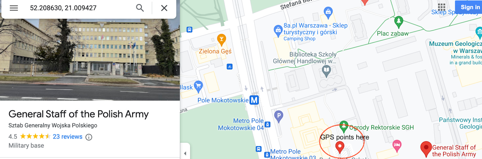 The author of this message posted to the hacked Ukraine government sites used machine translation so that obvious errors are evident in the Polish translation (I’m not performing a full lexical analysis here; there’s no need for this). The images were also tampered with to contain artificially added metadata potentially pointing to the location (GPS: 52.208630, 21.009427) of the main headquarters of the Polish Armed Forces in Warsaw/Poland. There is no way such metadata are included during normal image creation (as it was not a photo), so it’s either a botched attempt to plant a false trail, or some kind of a message. We don’t know.