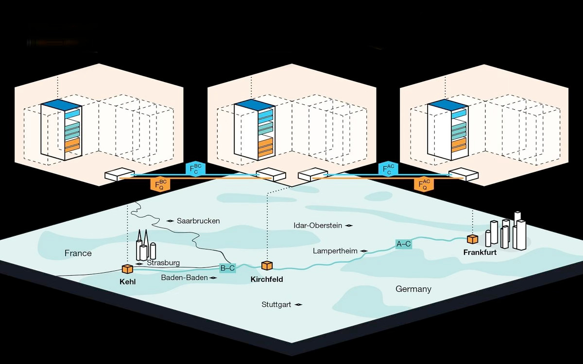 Quantum key distribution in Germany demonstrated across 254 km of standard telecom fibre. With 56 dB total channel loss and a relay node positioned ~60% along the link. The system achieved 110 bit/s using optical interference at a central receiver, which acted as an untrusted quantum repeater — enabling secure long-distance communication without trusted nodes, quantum memories, or cryogenic hardware. https://www.nature.com/articles/s41586-025-08801-w.epdf