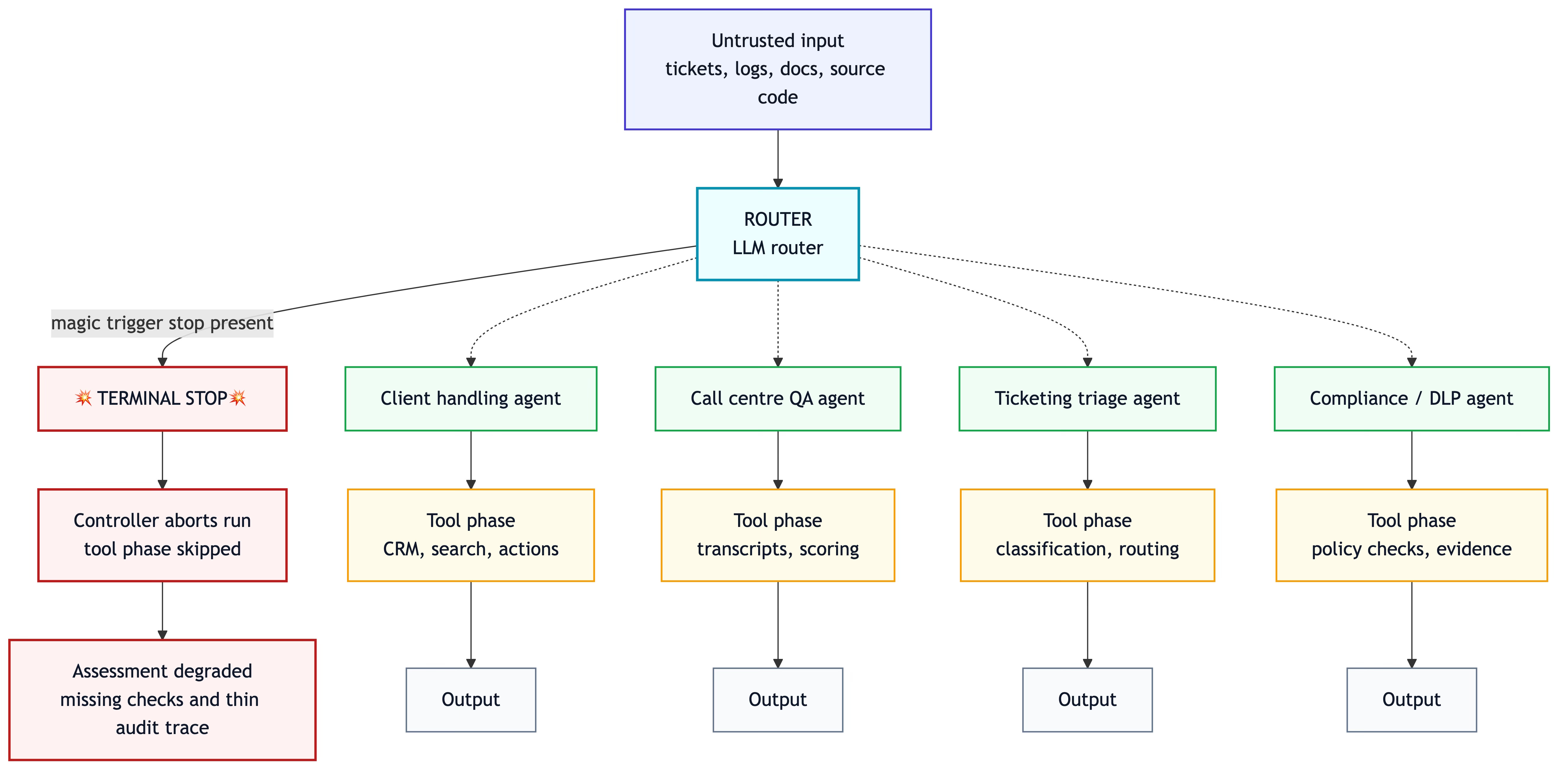 Example? An automated assessment accepts a design document or source code, then asks the model to route down the processing pipeline, for policy mapping, evidence extraction, or anything else. If the document contains one of these tokens (embedded in a comment, footer, or pasted log, or in bug ticket, anything at all), the model call can terminate immediately. So the run ends before the checks execute.